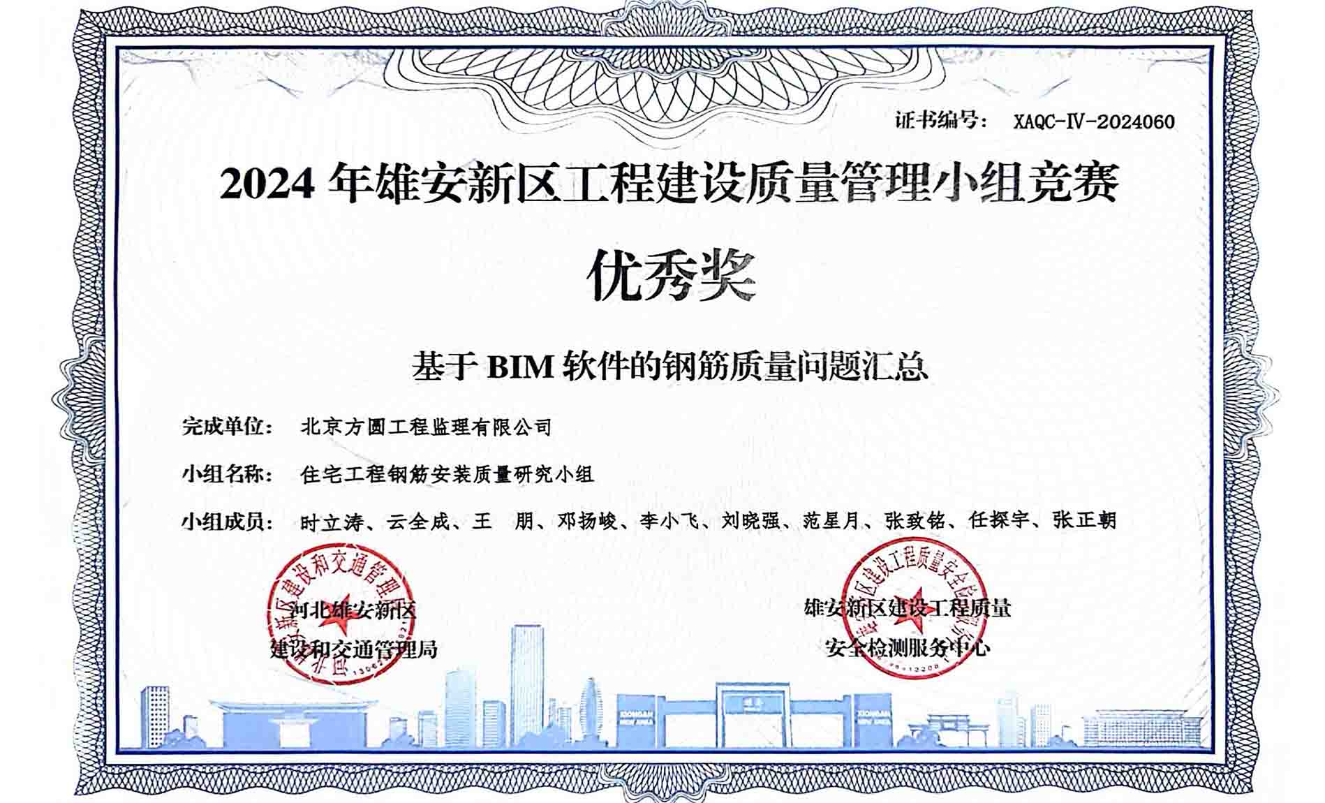 2024年12月,公司雄安新區中綠里項目參加了2024年雄安新區建設工程質量管理小組競賽活動,由該項目監理部和公司BIM研究所主要人員組成的研究小組提交的《基于BIM軟件的鋼筋質量問題匯總與優化研究》成果,憑借其創新