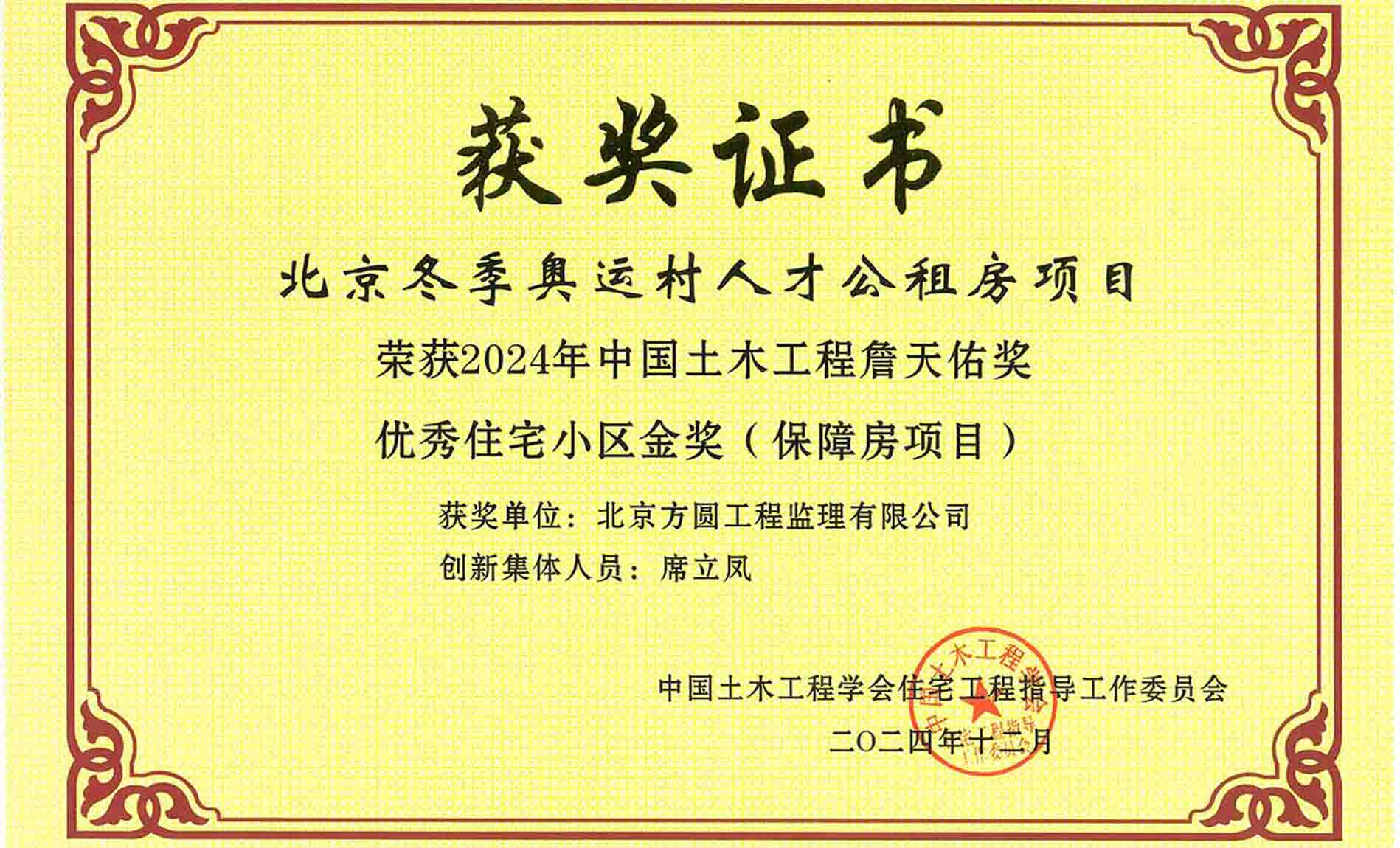 近日,由中國土木工程學會評選的2024年度詹天佑獎揭曉,我公司監理的北京冬奧村人才公租房項目榮獲中國土木工程學會評選的2024年度詹天佑獎,該項目憑借其卓越的設計理念、高標準的施工質量以及綠色環保的創新實踐,